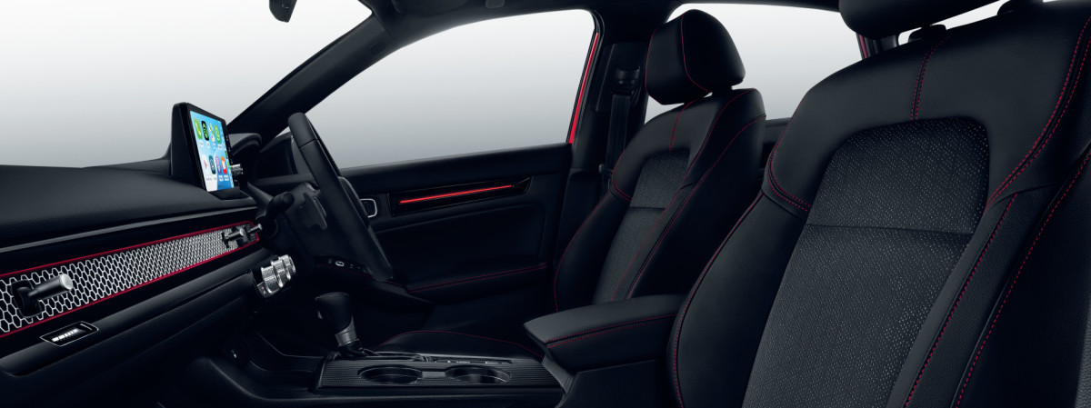 Bold red stitching gives a sporty touch to black premium leather upholstery.