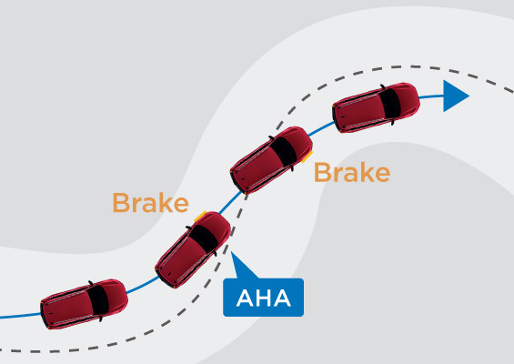 Offers corrective steering and engages the brakes if the vehicle appears to stray from an identified road.