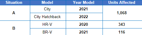 This recall is a precautionary safety measure to inspect the nut tightening on the ACG terminal of the engine harness. This may cause poor contact terminal and battery malfunction which may lead to engine halt while driving or unable to start the engine after the car stops. The models affected are 1,068 units of City 2021 Year Model and City Hatchback 2022 Year Model.
